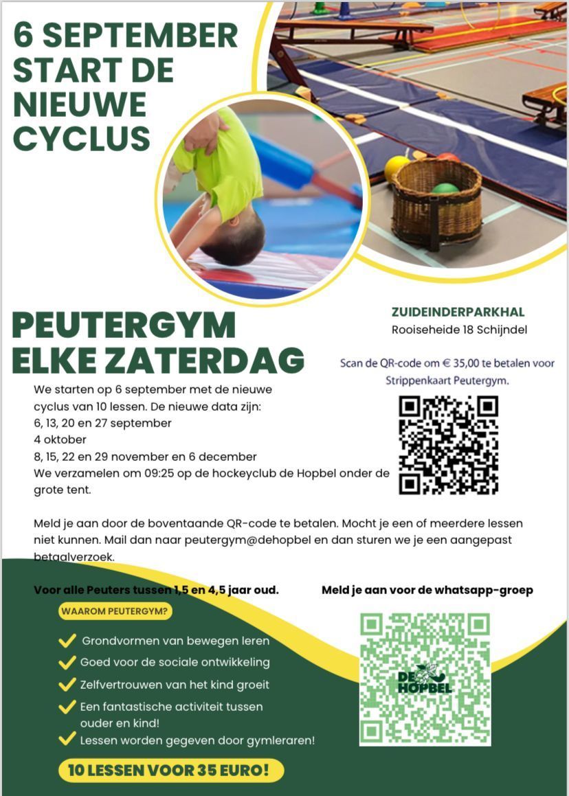 Bij SMHC De Hopbel kun je je leven lang sporten! Zo kennen we ook Peutergym. Dat betekent samen met je peuter (1,5 tot 4 jaar) op zaterdagochtend lekker bewegen in de Zuideinderparkhal.